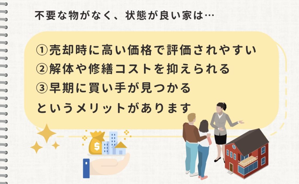 実際、建物や室内がきれいに整理・清掃されている家ほど、不動産会社や買主からの評価が高くなります